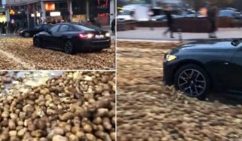 Un șofer a rămas împotmolit cu un BMW în cartofii aruncați pe stradă de fermieri, la protestul din Bruxelles