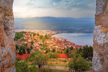 Lacul Ohrid, situat pe frontiera muntoasă dintre Macedonia de Nord...